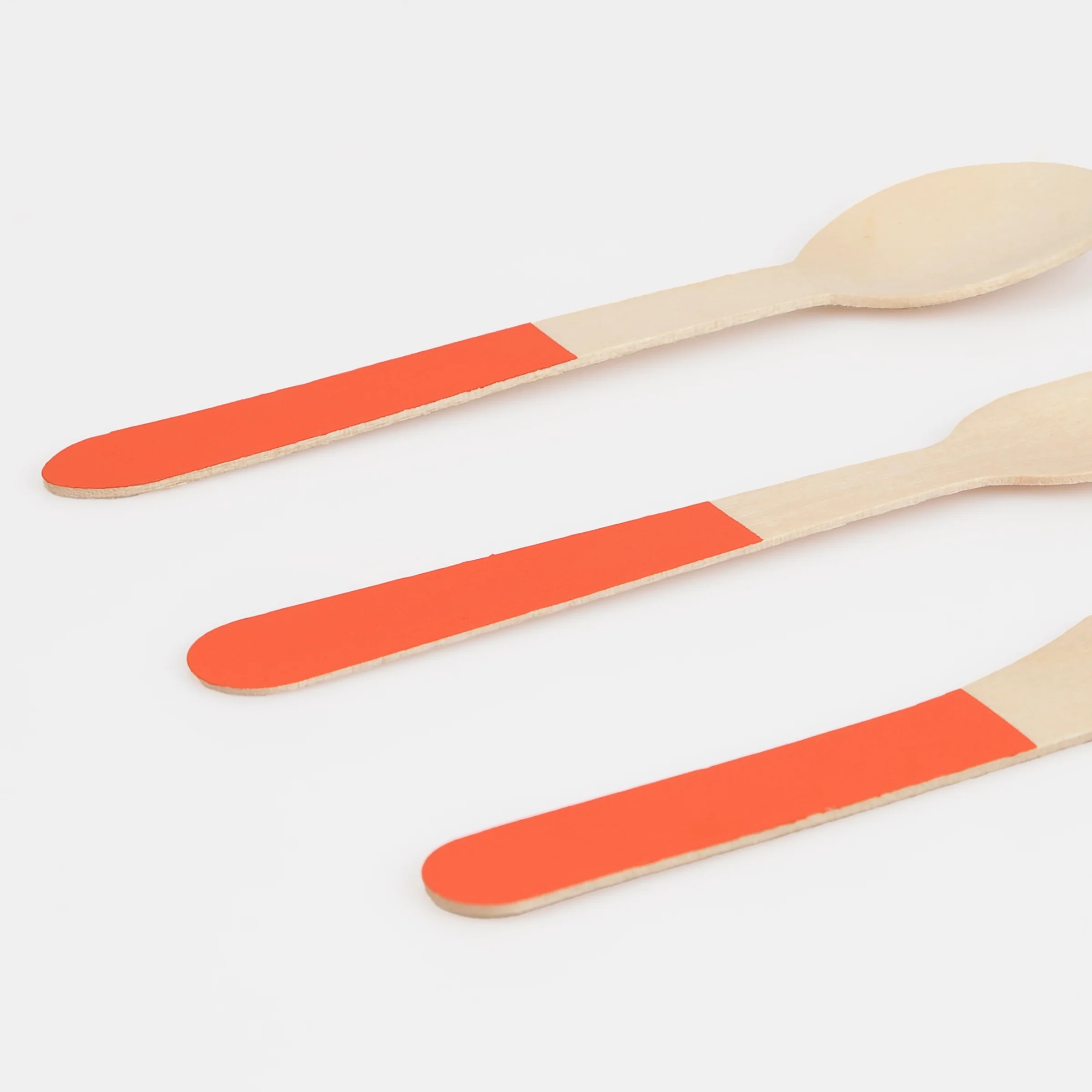Who says disposable cutlery can't make a statement? Forget the ordinary, our wooden cutlery sets blend practicality with style. They are ideal for picnics, garden parties, BBQs, camping adventures, or anytime you're skipping the sink. This flatware set features tomato red handles to effortlessly complement the rest of your tableware, or add a bright splash of vibrancy to your meal.